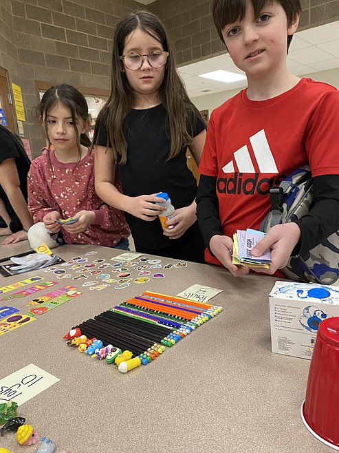 From left, West Ridge Elementary third graders Kylie Legerton, Brynlee Riekena and Cooper Norris spend Cougar Cash on a Bluetooth speaker, mystery prizes and a ticket to the monthly party as part of their school's Positive Behavior Interventions and Supports programming. At West Ridge, Cougar PRIDE stands for “Perseverance, Respect, Integrity, Dependable and Empathy.”ARTICLES BY JOSH MCDONALD