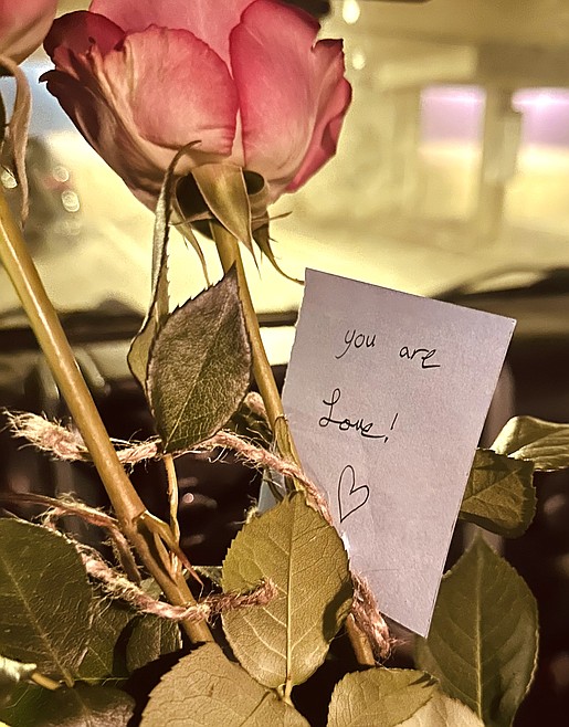 Two pink roses and a handwritten note. One said, “You are love” with a drawing of a small heart. The other, “You’re so very loved.”