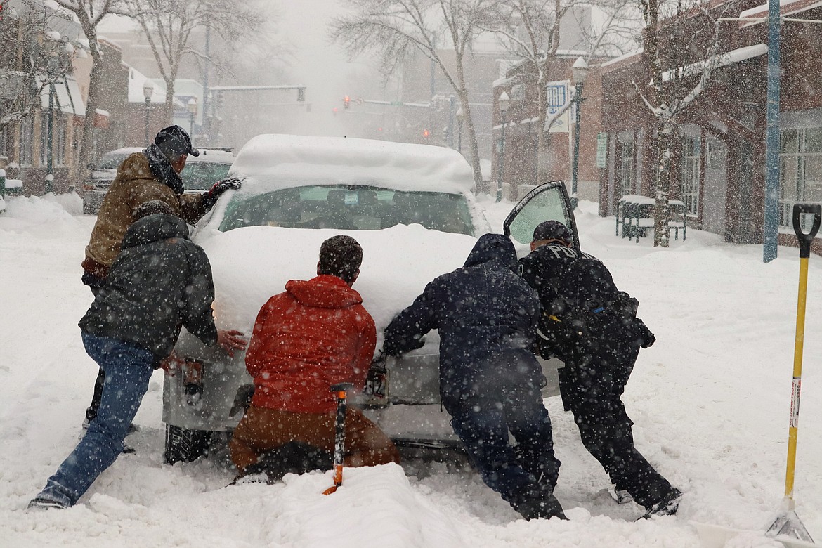 They shoveled snow from under the car and cleared it from the front and rear. They rocked and pushed the small silver vehicle, until finally, after about five minutes, it rolled free.
