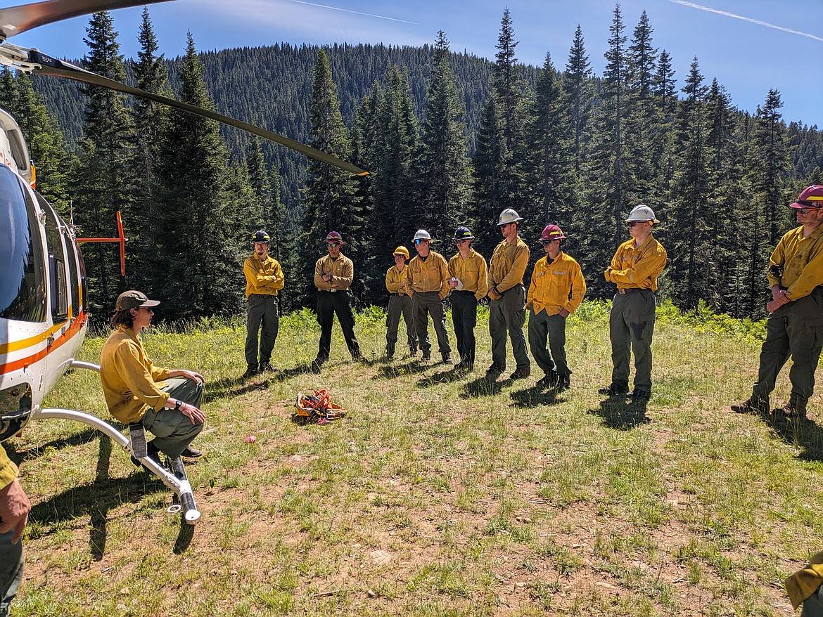During the simulation, crews were assigned to tackle four large bonfires. They dug fire lines using shovels, hoes and pulaskis to prevent fire spread. To enhance realism, crews could request water bucket drops from a Type 3 Bell 407 helicopter. The Panhandle Helitack crew provided a hands-on briefing about the aircraft's capabilities for fire suppression.