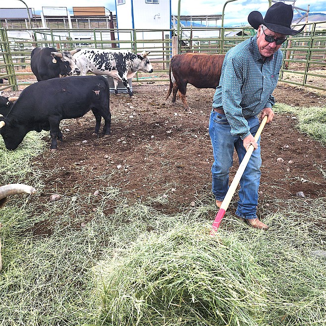 It was supper time for the 406 Rodeo bucking bulls, horses and ponies at the Polson rodeo grounds. Spotted, black, grey, bay and brown animals all stared at a big bale of hay on the other side of the fence, drawn as if to a tasty green magnet. Joe DeMers cut the strings on the bale and started pitching hay over the fence to the first pen of bulls.