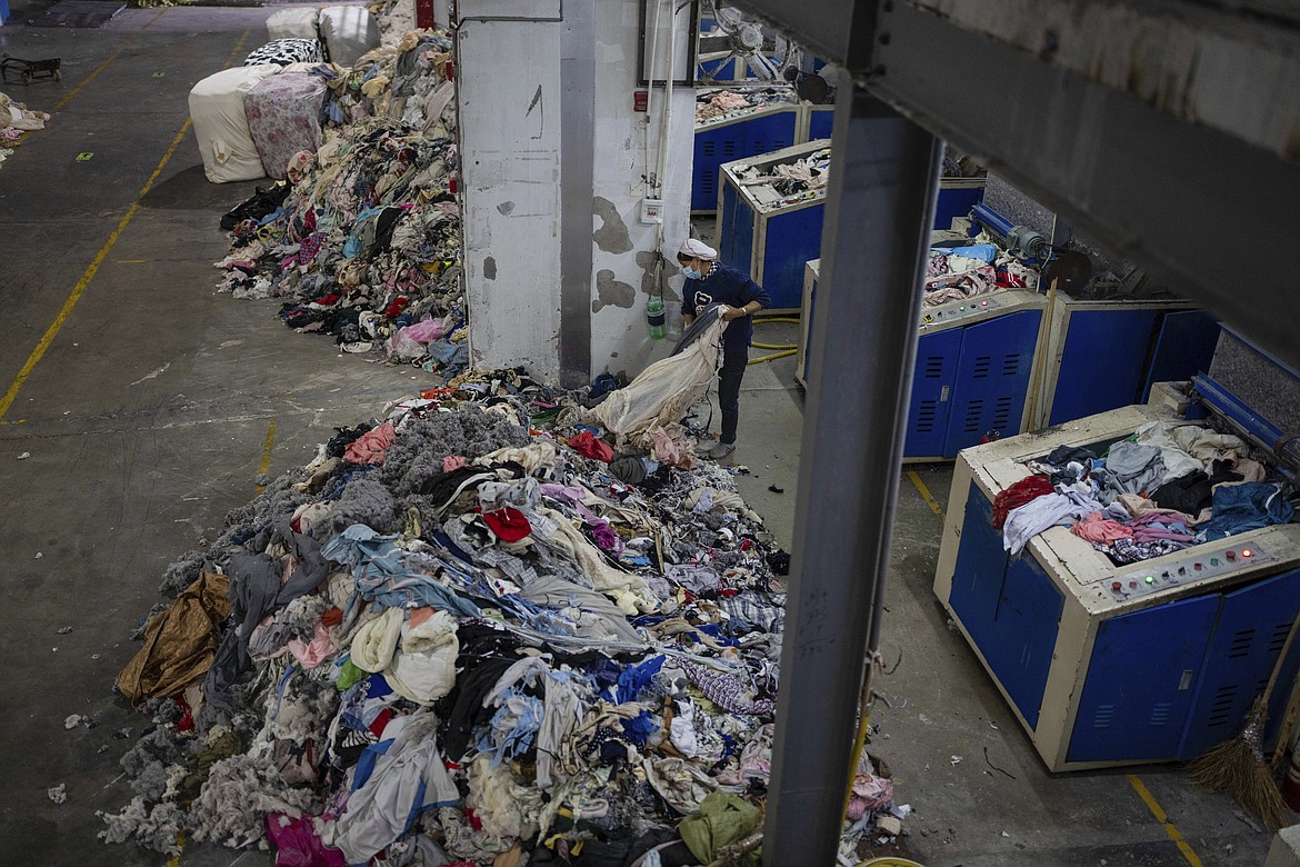 WENZHOU, China — At a factory in Zhejiang province on China’s eastern coast, two mounds of discarded cotton clothing and bed linens, loosely separated into dark and light colors, pile up on a workroom floor. Jacket sleeves, collars and brand labels protrude from the stacks as workers feed the garments into shredding machines.