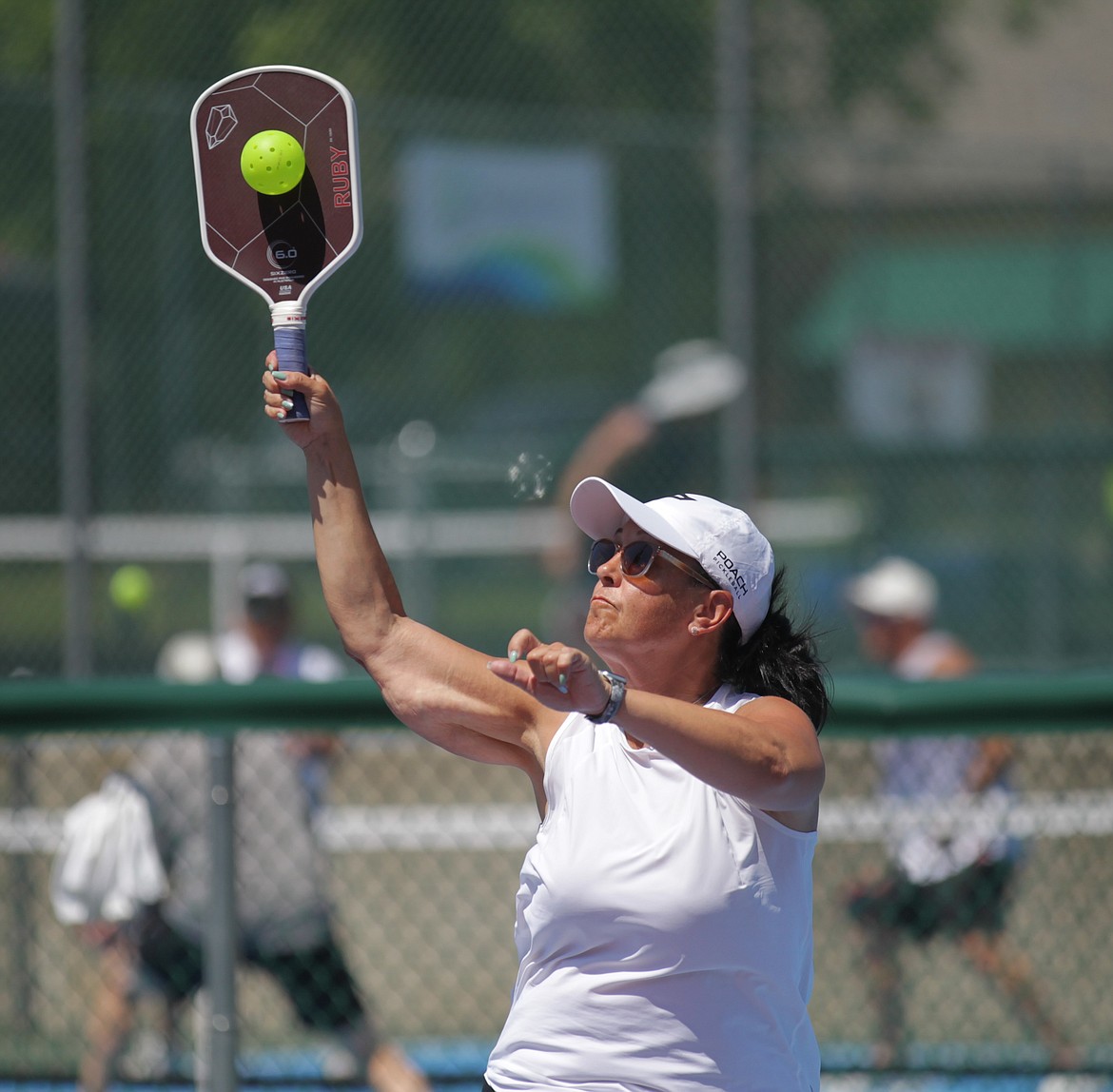 MARK NELKE/Press Pam Olive of Chestermere, Alberta, hits a return during the annual Coeur d'Alene Classic pickleball tournament Friday at Cherry Hill Park in Coeur d'Alene. Olive partnered with Christy Daurie of Okotoks, Alberta, in the women's doubles 3.0 age 50-55 division.