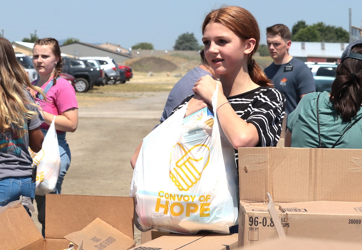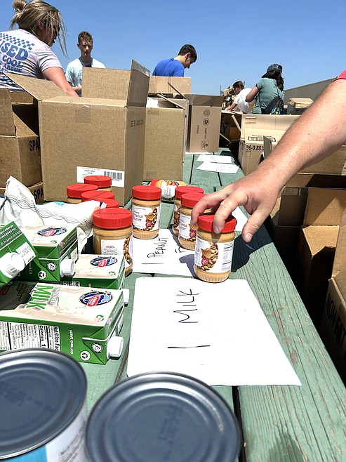 Some walked and others ran as they carried boxes delivered by semi-trailer trucks to rows of tables that were lined by volunteers, both local and visitors. When a food item was needed, a friendly shout rose up.