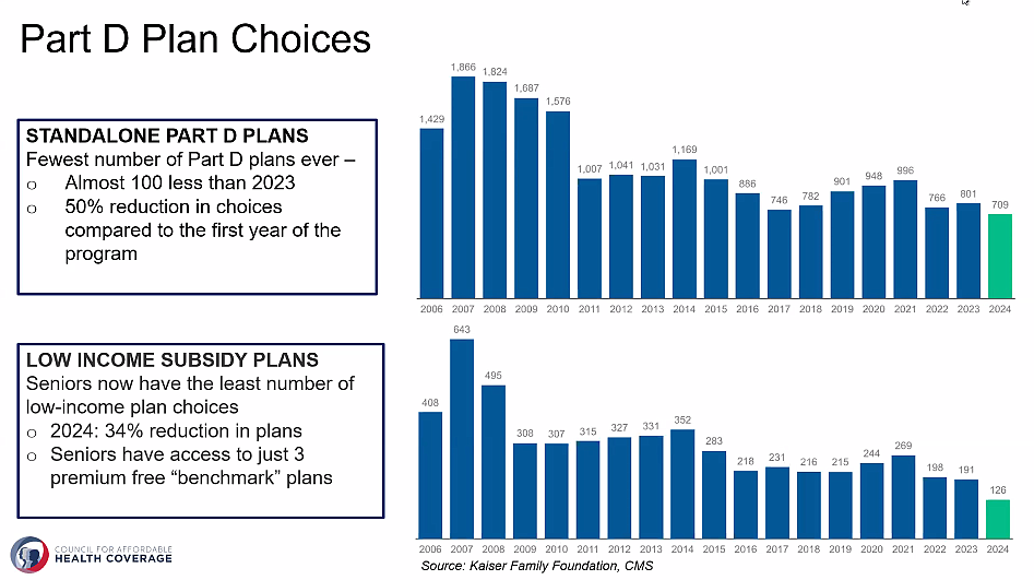 So far, from 2023 into this year, there has been a drop of about 100 standalone plans available in the Part D marketplace.