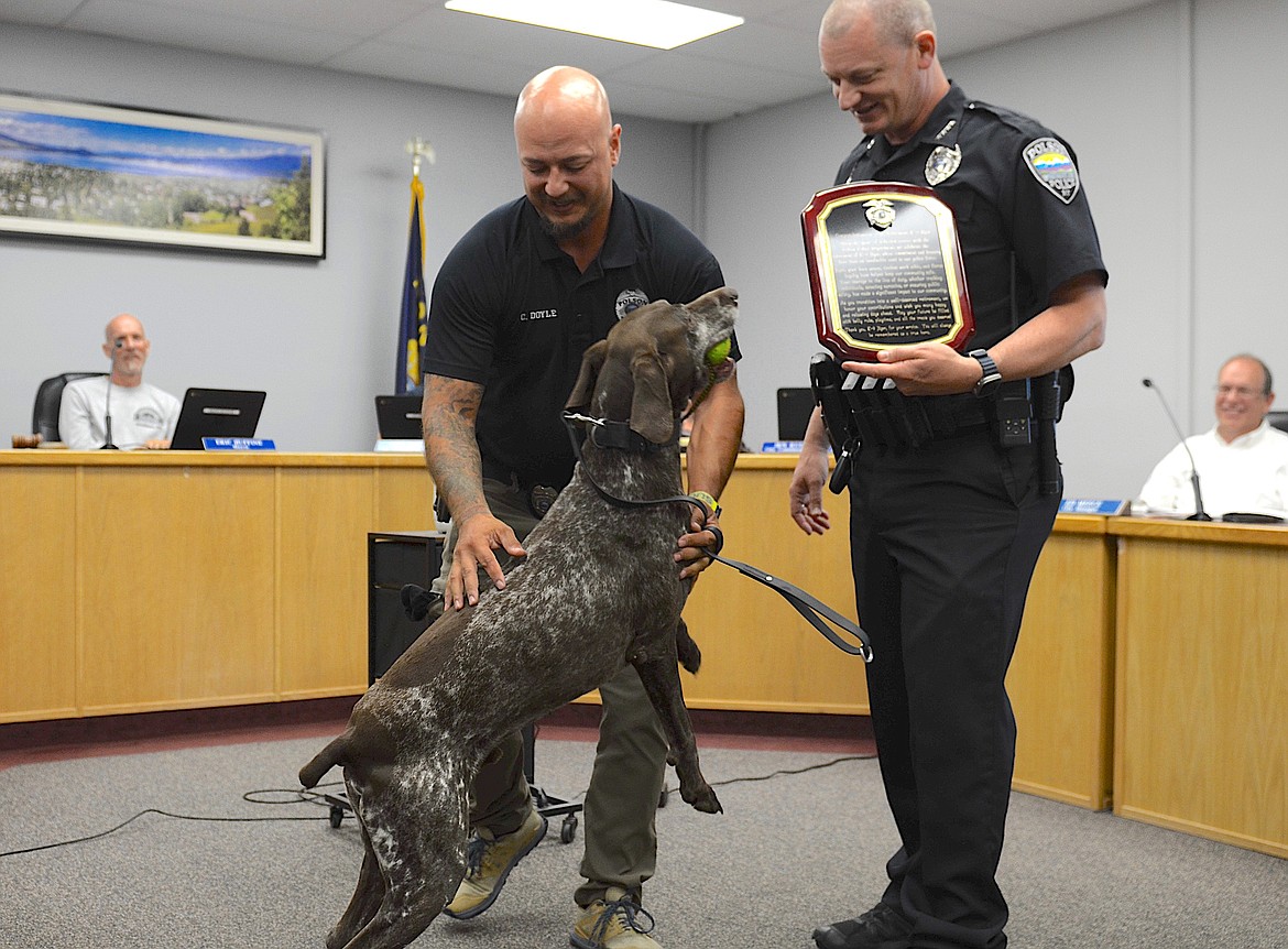 First, K-9 Police Officer Jager made a boisterous appearance at City Hall, as Polson Police Chief George Simpson commended the German shorthaired pointer and his handler, Officer Cody Doyle, for “six years of dedicated service.”