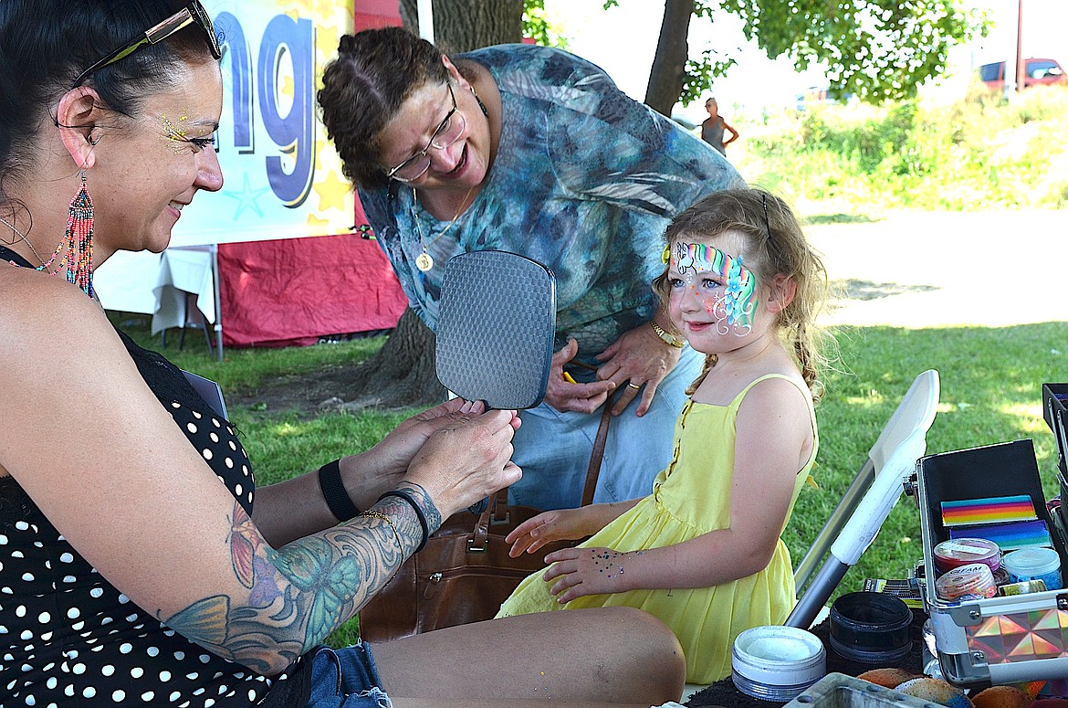 At another booth, Colorado metalsmith Jenny Kenyon sized a delicate silver bracelet for Jamie Gralapp of Polson, while further down the corridor of shady booths, girls waited in line for a fanciful face-painting by Nicki Gell. Ceramics, stained glass, paintings, photographs, fabric art and hand-forged sculptures were also among the offerings. Several food purveyors were on site too.