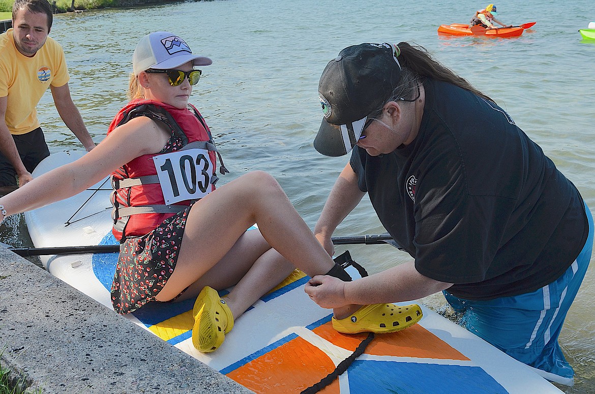 According to Amber Stanfield, a development associate with the Lakers, Thompson gave safety talks before each launch. The card dealers at the seven Poker Paddle stops were each equipped with walkie-talkies to help them keep a close eye on the event’s 143 participants as they navigated the lake’s choppy waters Saturday morning. As an additional precaution, photos were taken of each paddler before they launched.
