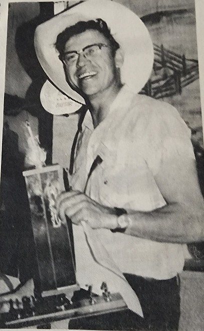 The display is a scene from the McAlear Realty Company, located on Main street. Mr. McAlear’s roll top desk, original typewriter, filing cabinet, chaps and boots are included.