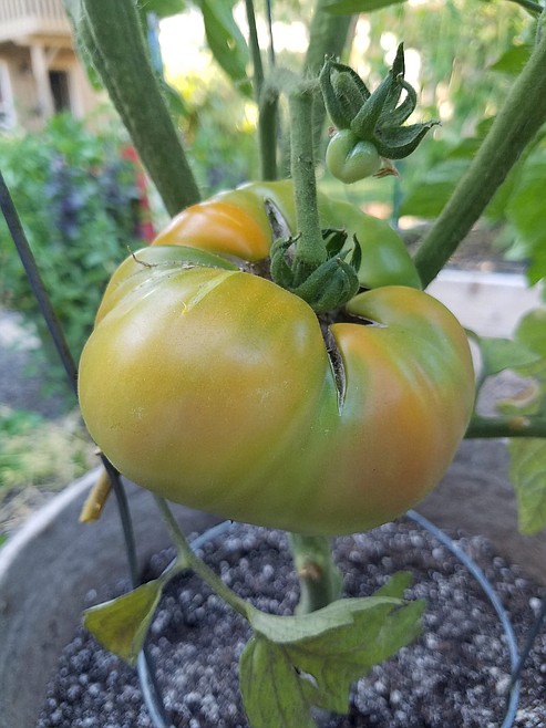 You may also see some odd-looking tomatoes developing on the vine. These are usually the first fruits set on the plant and may exhibit several fruits fused into one, be severely misshaped, or have zig-zagging scars on the skin (or all of the above). Talk about Franken-fruit!