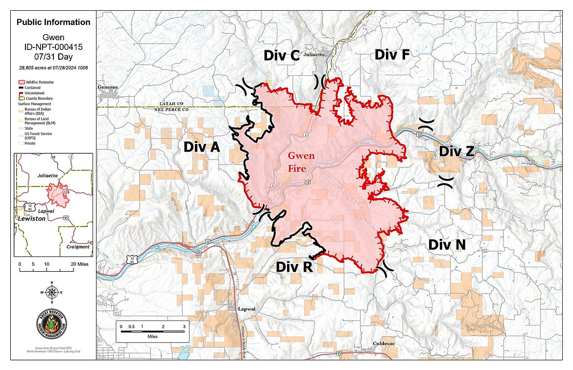 Firefighters took advantage of the cooler, wetter weather and were able to make significant progress in finding and extinguishing hot spots in all areas of the fire yesterday. Containment has increased to 34 percent, according to a press release from the Idaho Department of Lands.