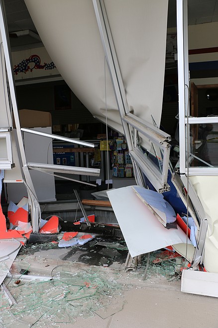 Post office crews were en route by 3:30 p.m. to assess the structure and to board up the building, which suffered significant damage in the crash. In addition to the support beam for the overhang being pushed down, the car ended up partway into the building, shattering several glass panels and stopping near where customers pick up mail or drop off packages at the front counter.