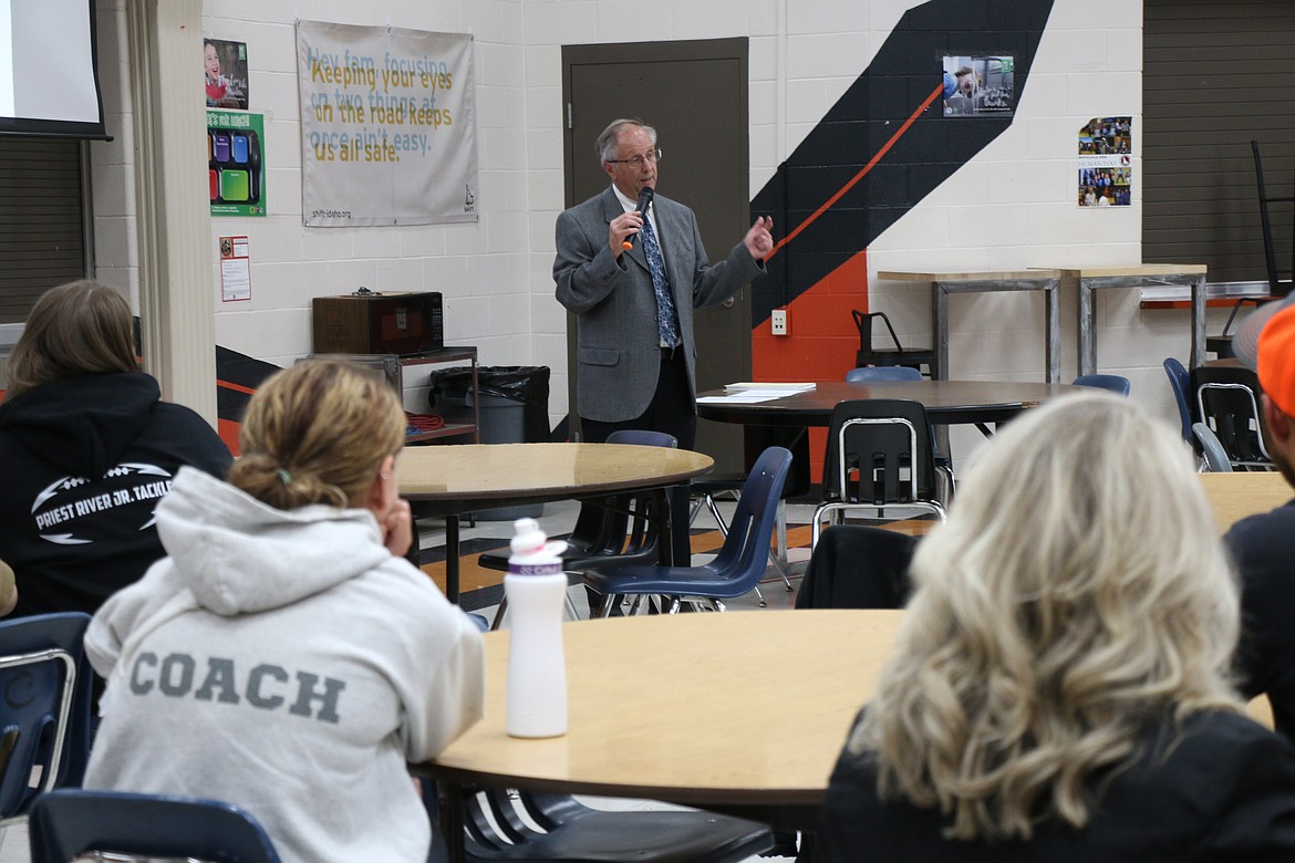 "Well, I think the first thing is that I don't shy away from challenges," he told parents and community members filling most of the tables in the Priest River Lamanna High School cafeteria.