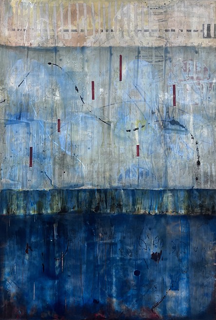Caughey is inspired by the unique properties of the materials she uses. At the center of the exhibit is “Oceana,” a 6-foot by 4-foot encaustic painting on a wood panel. This statement piece blends shades of blue in the background with an overlay of geometric shapes, lines, and other marks. Made from hot wax, encaustic paint has many features that are not seen in oil paint. Layers can be smoothed out or scraped away to form texture and the wax’s translucency can create a sense of depth and dimension.