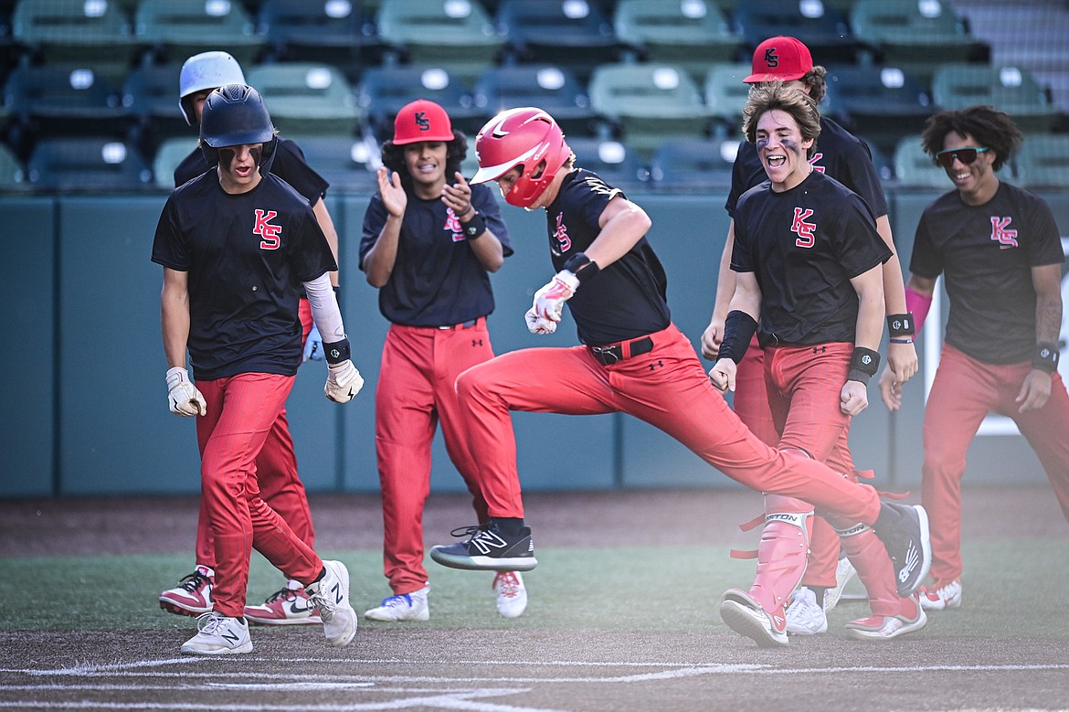 Kalispell Sluggers' Nico Young (4) and Jordan Griffin (0) celebrate after Griffin's inside-the-park home run against Federal Way during the Badrock Invitational at Glacier Bank Park on Friday, June 28. (Casey Kreider/Daily Inter Lake)