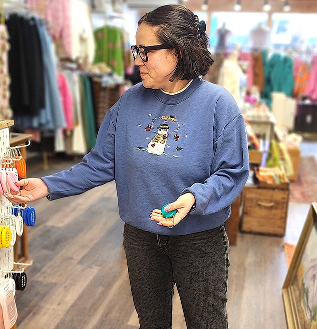 She stocks cute sweaters (a favorite of hers), corduroy pants in punchy colors, a rack of “pre-loved clothing,” and an eclectic array of vintage jewelry, house decor and plants.