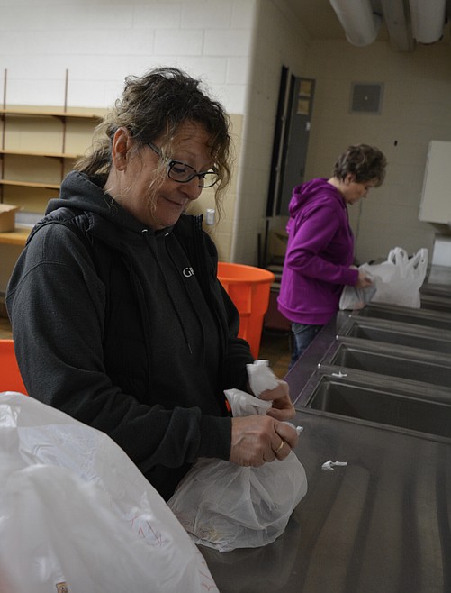 KELLOGG — The assembly line of volunteers worked like a well-oiled machine, collecting two breakfast items, two main meals to go and some fruit and other snacks before depositing tied plastic bags at the end of the line.