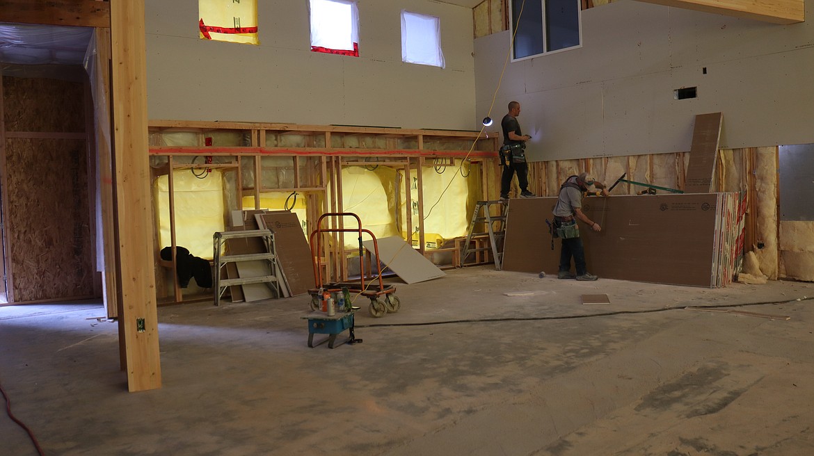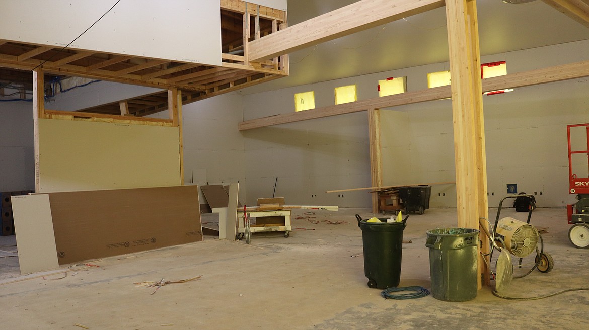 Construction crews recently have been putting up drywall. After that’s complete, they’ll spray the acoustic ceiling and start painting.