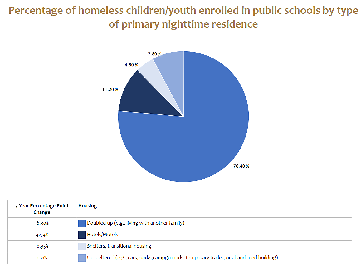 The National Center for Homeless Education defines terms related to homelessness as being doubled‐up and living with another family, using hotels or motels as temporary housing also are common factors, shelters or transitional housing.