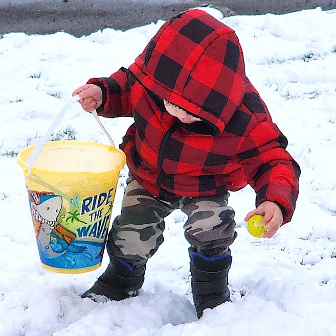Sunday’s surprise snow around Ninepipes Lodge was dotted with brightly colored Easter eggs, and children in hats, mittens, and warm boots hunting for them.