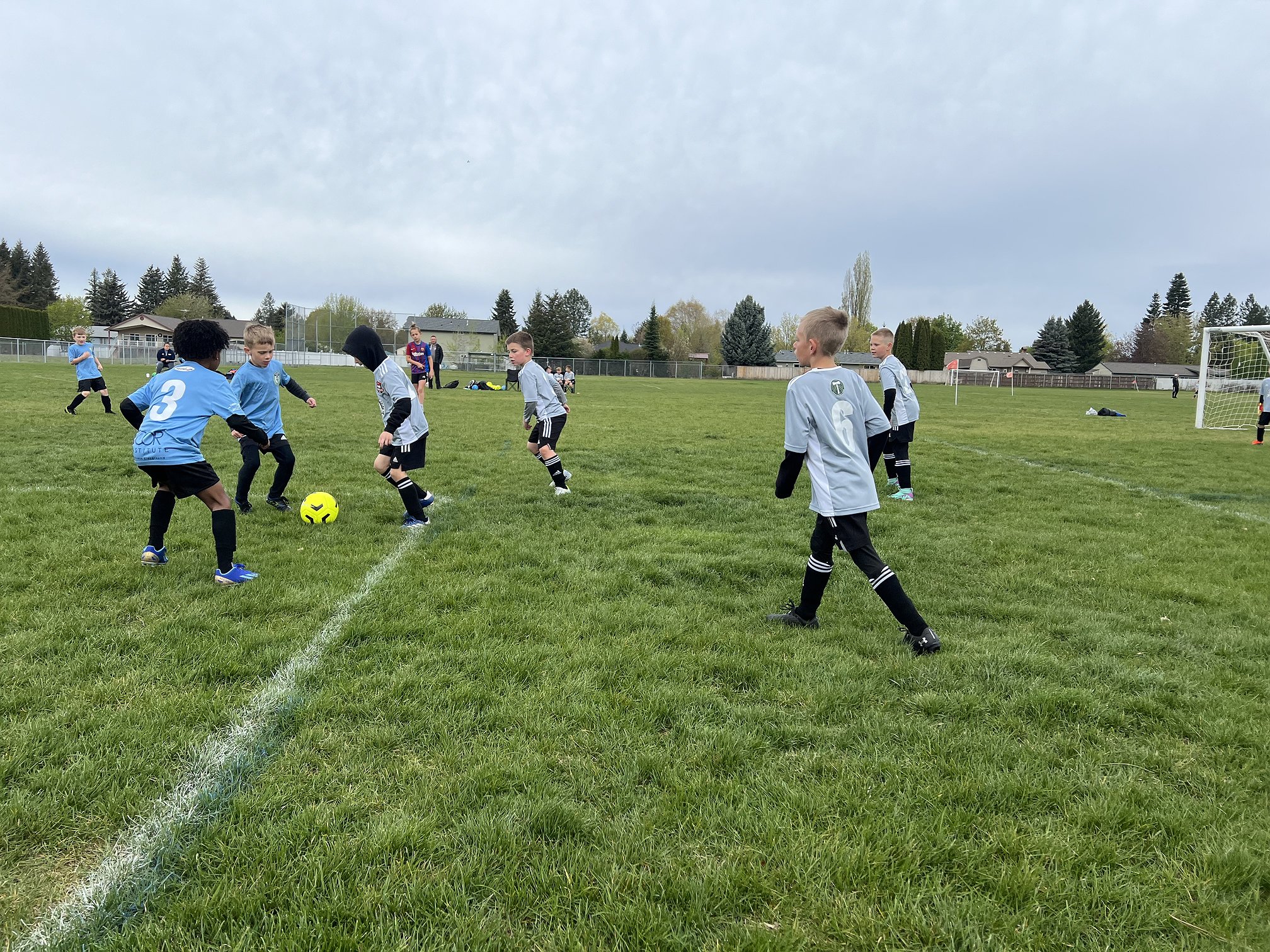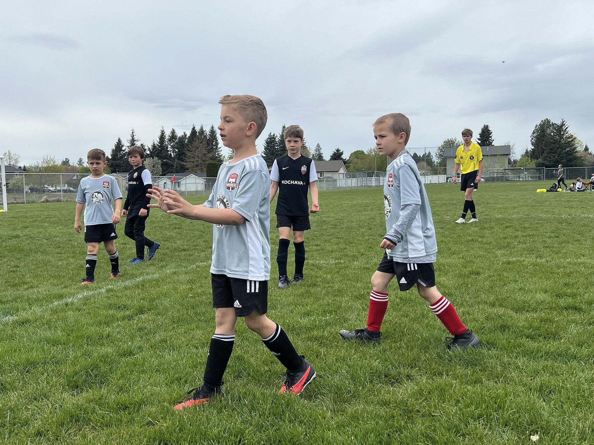 Photo by KATHY STERLING The Timbers North FC 2016 Boys Red soccer team beat the Spokane Sounders B2016 North Green team 8-4 on Saturday at Hayden Meadows Elementary. Red team goals were scored by Mitchell Volland (4), Greyson Guy (3) and Peyton Schock (1). From left in the gray jerseys are Grayson Martino, Peyton Schock, Jacson Matheney and Isaak Sterling.