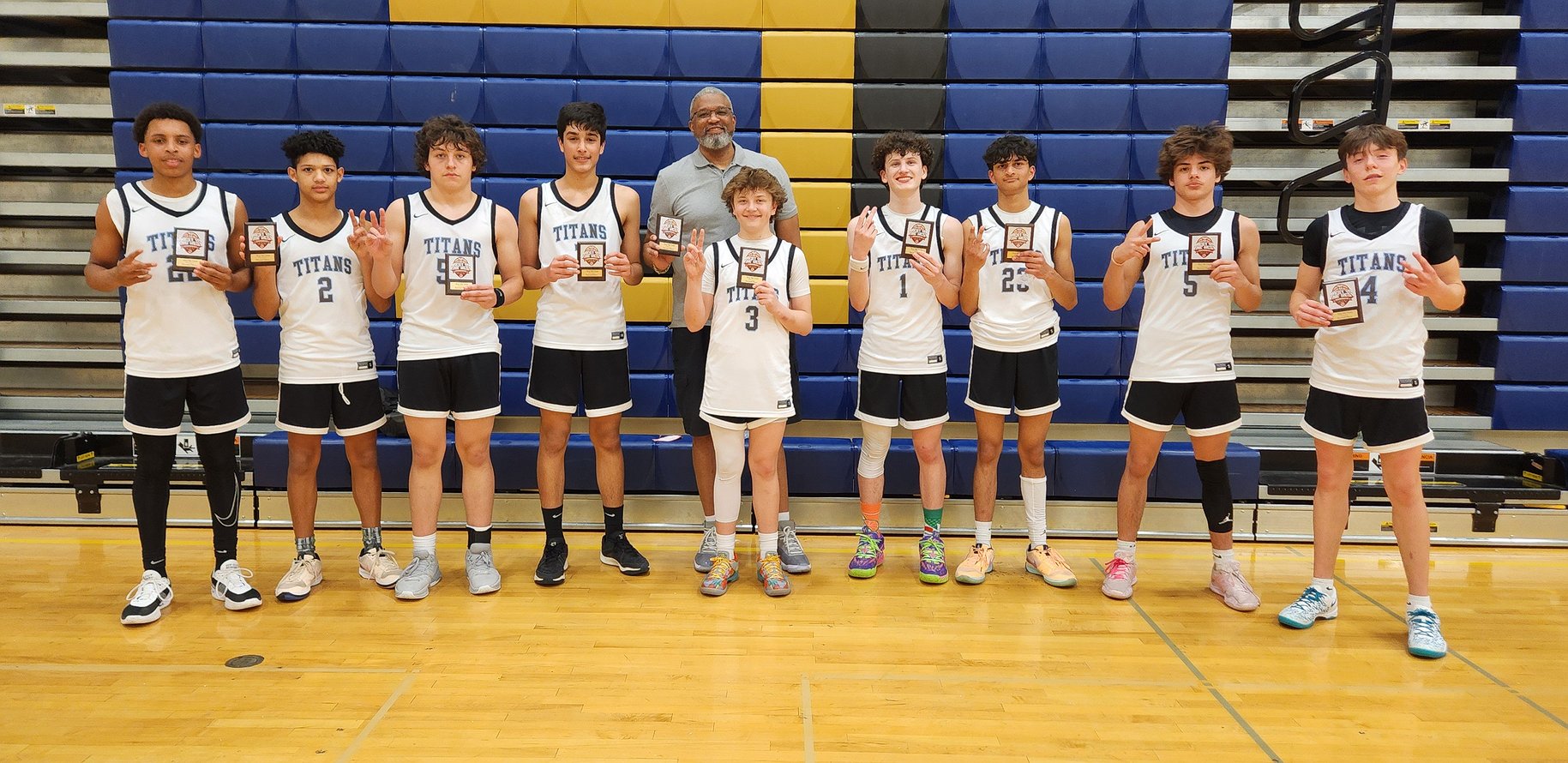 Courtesy photo The Titans AAU boys basketball team took second place in the ninth grade division on Sunday at the Best in the West Tournament in Yakima, Wash. From left are Miles Spencer, JaKolbe Lopp, Rex Arroyo, Arjuna Kandola, coach Leon Sayers, Sawyer Norisada (Post Falls), Wallace Frates, Vihaan Rajeev, Makya Quincy (Post Falls) and Evan Drew.