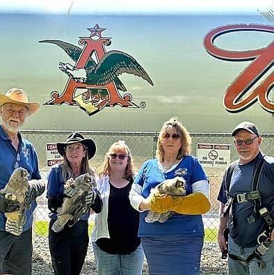 The nest received some much-needed fortification, thanks to hop farm employees Emily Schulze and Than Widner who constructed a new nest. After nest repairs were completed Birds of Prey Northwest returned to Bonners Ferry with the young owls. Schulze and Widner were there to give the founding director of Birds of Prey Northwest a lift to the tree top, where the family was reunited.