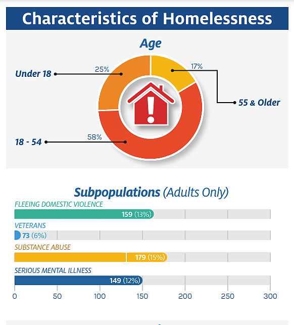 In the 2023 point in time survey of homelessness coordinated by Idaho Housing and Finance Association (except Ada County), 58% of homeless individuals are 18-54 years old, 25% are under the age of 18 and 17% are 55 or older. The same survey found that 15% were homeless due to issues related to substance abuse, 13% were fleeing domestic violence, 12% had become homeless due to issues related to serious mental illness and six percent are veterans.