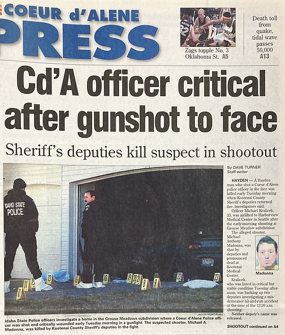 On Dec. 28, 2004, Mike, then 35, responded to a backup call from two deputies who were investigating a hit-and-run accident in the Grouse Meadows subdivision shortly after midnight. The suspect, Michael Anthony Madonna, 39, broke free while talking to a sheriff's deputy and Mike, ran into his house and grabbed a .357 Magnum. He shot Mike from 6 feet away.