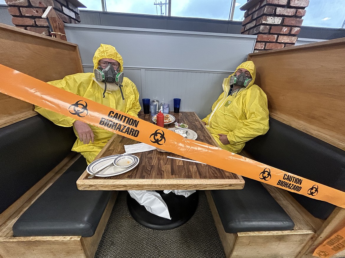 But on Halloween, he and employee Roger Slaugh decided to see if they couldn’t get a few laughs by donning their gear, complete with yellow overalls, air masks and white booties, while having lunch at the Breakfast Nook.