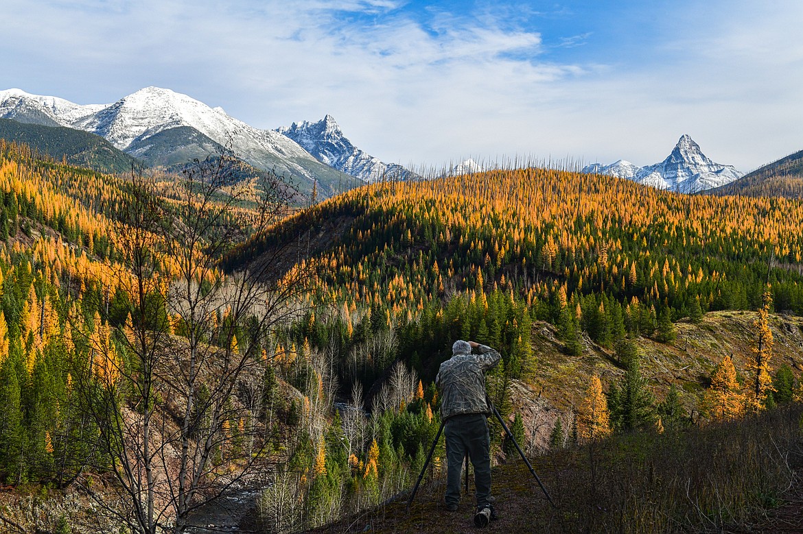 Snow-dusted summits rise up to fill the sky above hillsides covered in a vibrant tapestry of bright orange and yellow larches as the Middle Fork Flathead River weaves its way through John Stevens Canyon.