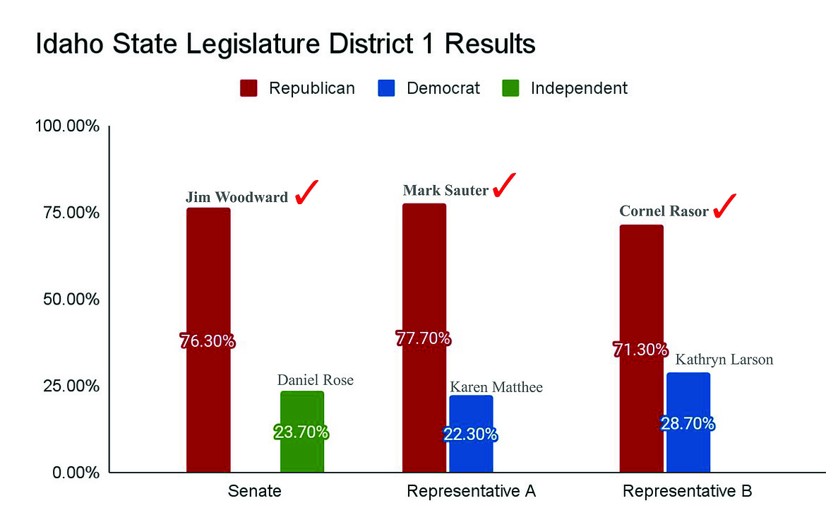 For state Senate Legislative District 1, Republican Jim Woodward handily defeated independent candidate Daniel “Dan” Rose to return to the seat. Districtwide, Woodward received 23,402 votes, or 76.3%, with 4,976 votes, or 72.49%, in Boundary County; compared to Rose's 7,286 votes, or 23.7%, with 1,888 votes, or 27.51% in Boundary County.