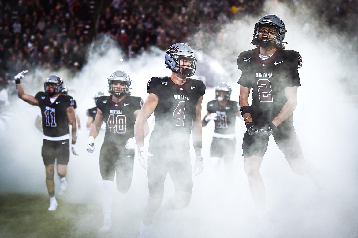 Smoke and fireworks hang in the sky as the Montana Grizzlies take the field before their matchup with UC Davis at Washington-Grizzly Stadium on Saturday, Nov. 9. (Casey Kreider/Daily Inter Lake)