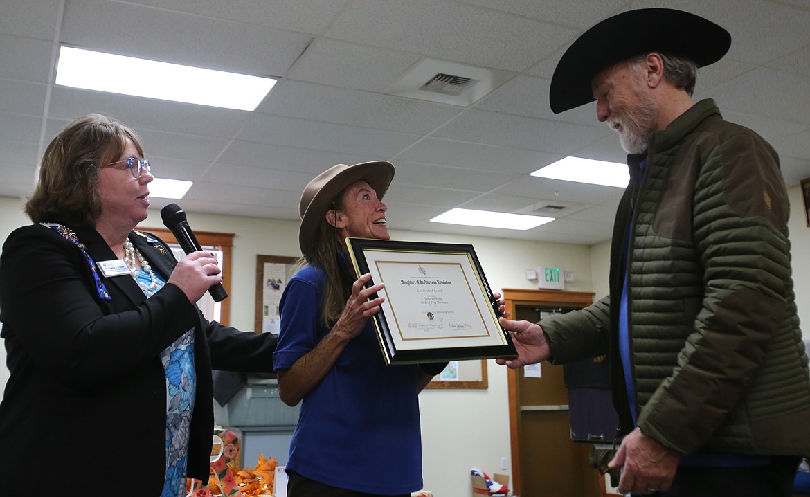 Members of the Daughters of the American Revolution Lt. George Farragut Chapter honored Veltkamp following a Birds of Prey presentation Friday morning at the Hayden Eagles, where a golden eagle named Dakota was among a few of the honored feathered guests.