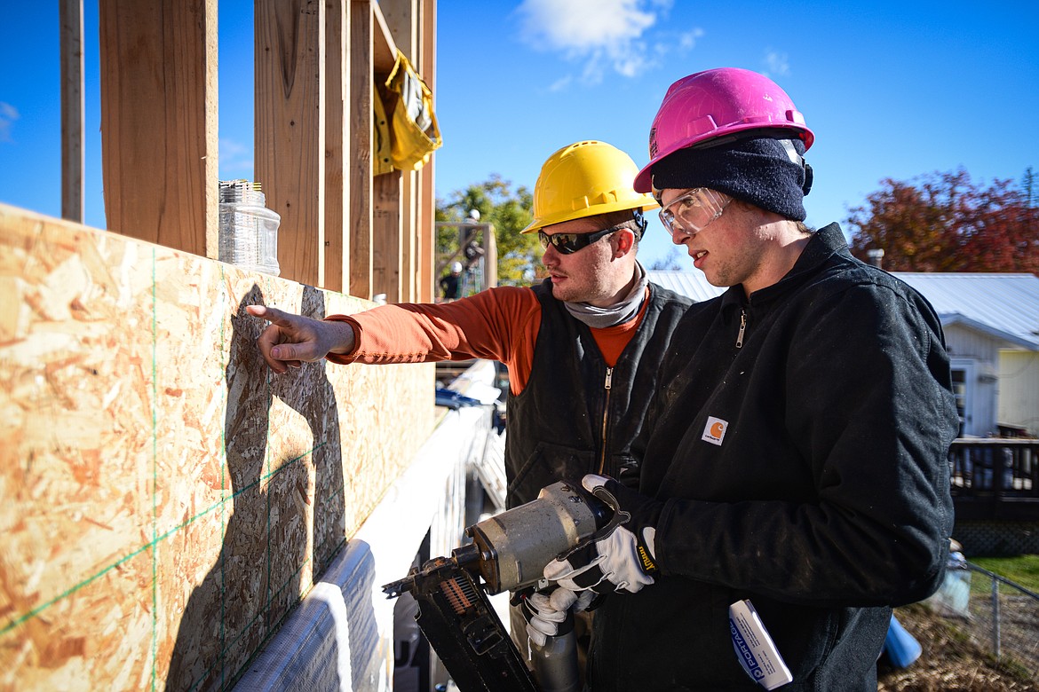 Construction Supervisor Stetson Jore fitted me with a work belt, a hot pink hard hat, safety glasses and a power drill. The work belt came with everything I guess I ended up needing; a tape measure, pencil, nails and screws. There was nowhere to put my reporter’s notebook, so I stuffed it in my Carhartt jacket pocket that hadn’t seen a speck of sawdust in its life.