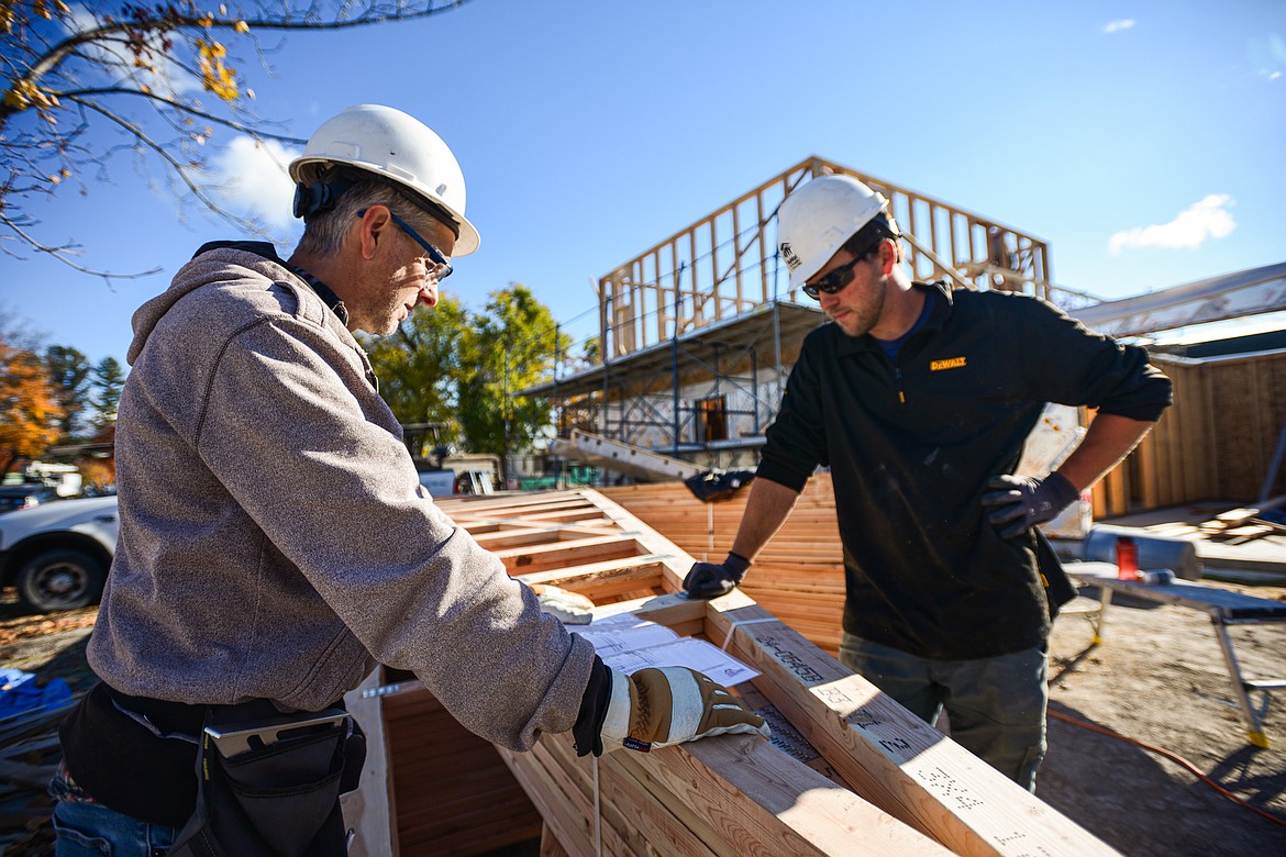Volunteer Bill Rubly cuts boards for the second-floor wall frame of a duplex-style townhouse being built by Habitat for Humanity of Flathead Valley and Northwest Community Land Trust in Kalispell on Wednesday, Oct. 30. With Rubly are fellow volunteers Brian Putnam and Jim Poplin. (Casey Kreider/Daily Inter Lake)ARTICLES BY JACK UNDERHILL