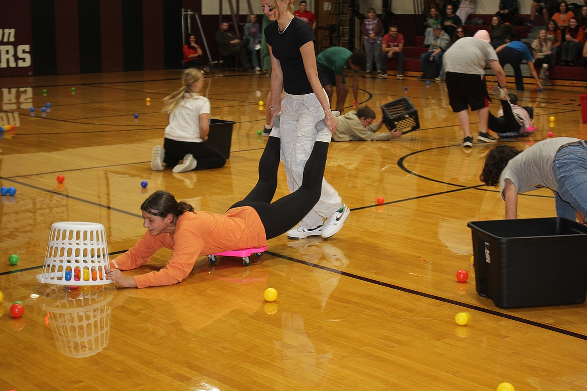 During the Alberton School Homecoming Pep Rally, one challenge was having teams compete to see which class could gather the most balls when released on the gymnasium floor. (Monte Turner/Mineral Independent)