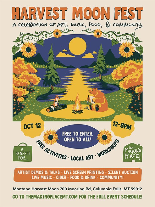 Harvest Moon Fest will be held on Saturday, Oct. 12 from noon-8 p.m. at 700 Mooring Road, Columbia Falls. This event will be a celebration of art, music, food and community in collaboration with the Montana Harvest Moon Homestead. The festival will feature artist booths, games and activities, artist demos such as pottery and screen printing, live music, an open mic, food, drinks and a raffle.