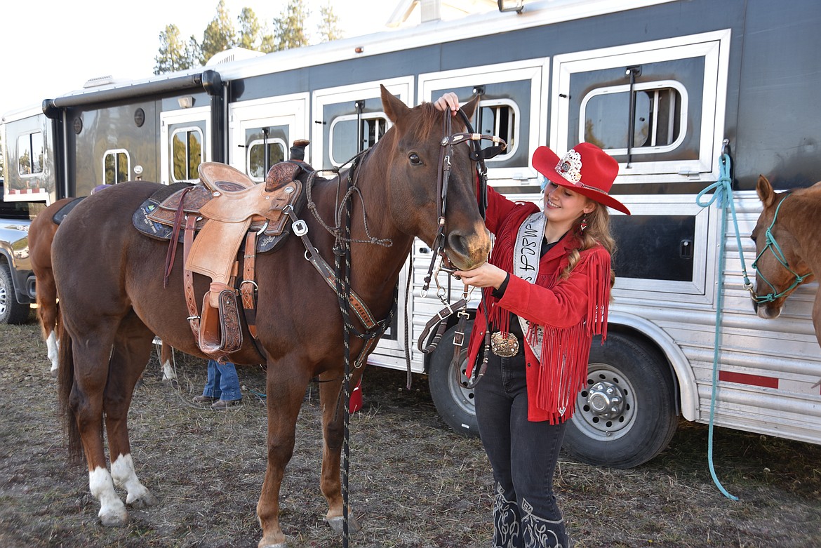Mounting the horses, 14-year-old Tuck of Columbia Falls and 18-year-old Erickson of Kalispell rode into a field by the Rocky Mountain Riders Saddle Club arena, the bright sun glinting off their sparkly sashes, bejeweled belt buckles and crowns adorning their cowboy hats.