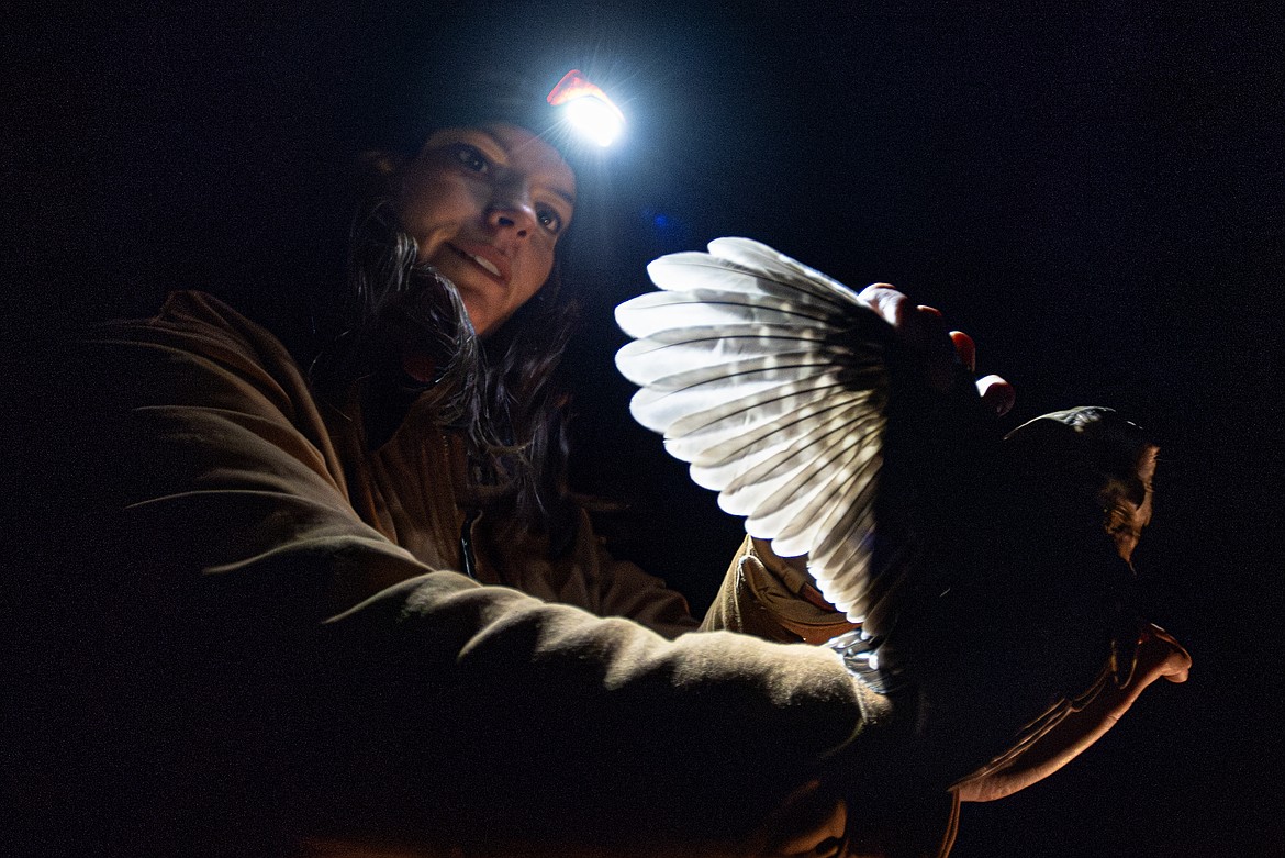 The first owl she emerges from the mist nets with is wide-eyed and quiet as Tate brings it to the lantern-lit banding table, visitors gathering around as she grabs a pair of sealing pliers to apply the bird’s leg band. She must check its heavily feathered legs for other bands first to make sure it isn’t double-marked. The metal band is perfectly sized for the owl, the pliers too, so no matter how hard she squeezes it shut, it can’t hurt the bird. She checks to make sure no feathers are caught before completing the seal. This way, each bird has an identifying number in case of recapture that can help researchers track its travels.