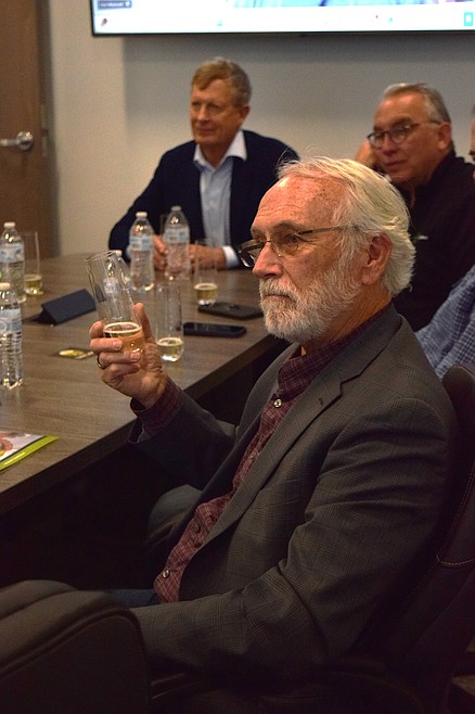 Alicia Devereux waits to pour a sample of the pineapple-mango cider as Mark Stennes finishes the last sample during the round table and cider sampling at Okanagan Specialty Fruits Friday. Everyone tried three ciders from the Endless Orchard brand – golden delicious, blueberry-basil and pineapple-mango.ARTICLES BY NANCE BESTON
