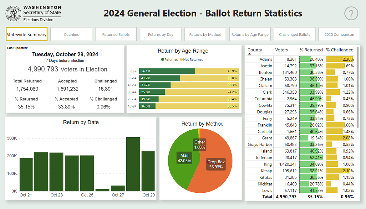 As of Monday, there were 49,867 registered voters in Grant County, of whom 9,742 had already turned in their ballot, according to the Washington Secretary of State. This equates to around 19.54% of ballots returned. Of the returned ballots, all but 203 of them were accepted without challenge.
