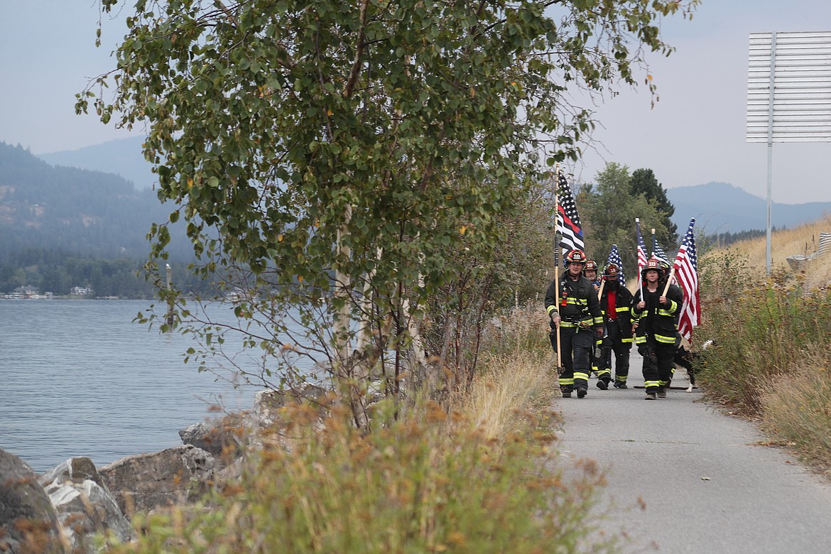 Carrying American flags, dressed in full firefighting turnouts, six members of the all-volunteer Clark Fork Fire Department walked across the Long Bridge on Wednesday to pay tribute to the firefighters and other first responders lost in the 9/11 terrorist attacks.