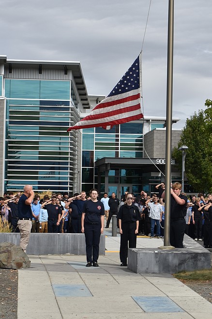 Two student-organized ceremonies marked the occasion at the Columbia Basin Technical Skills Center, one at 8:05 a.m. and another at 11:30 a.m. Students from the Criminal Justice and Fire Science programs raised a flag and then lowered it to half staff, and a Fire Science student rang the Four Fives, while the rest of the student body looked on respectfully and solemnly.