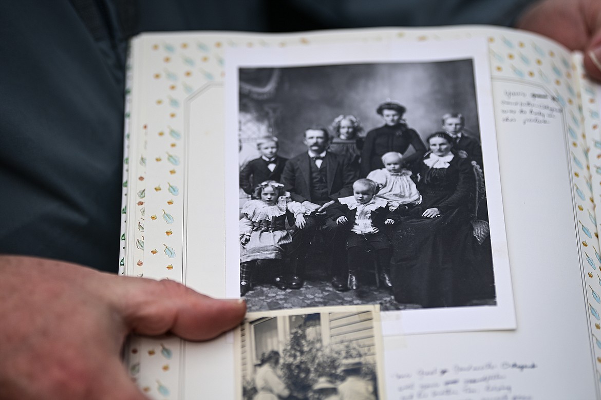 Odegard’s ashes, sealed in a metal box, were buried beside his sister Minnie in Conrad Memorial Cemetery. When Erika and Ike arrived for the burial, they began parsing through a memory book they had picked up from her brother’s attic, including a family history and old photographs.