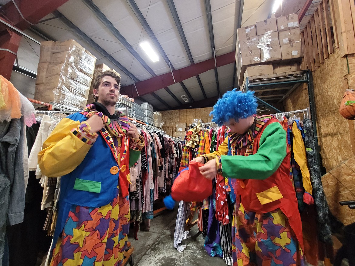 Many of the costumes, such as the denim overalls for the scarecrows, are found at thrift stores. Costumes are stored in a warehouse where they are carefully organized by scare zone.