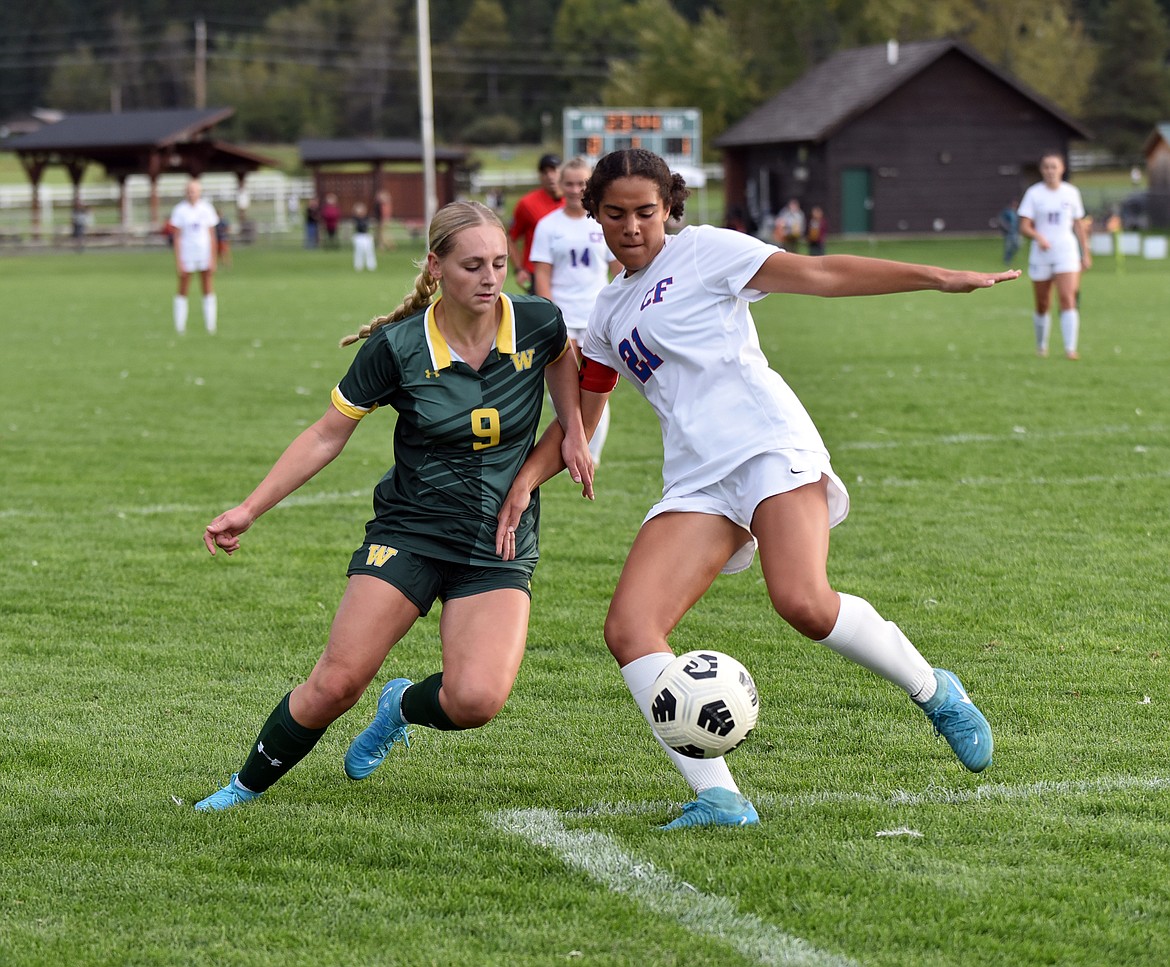 Columbia Falls scored first with a long, lofted shot by Evie Dorr in the 9th minute. Whitefish striker Delaney Smith took a pass from Charlize Ullrich and scored to go into halftime at 1-1.