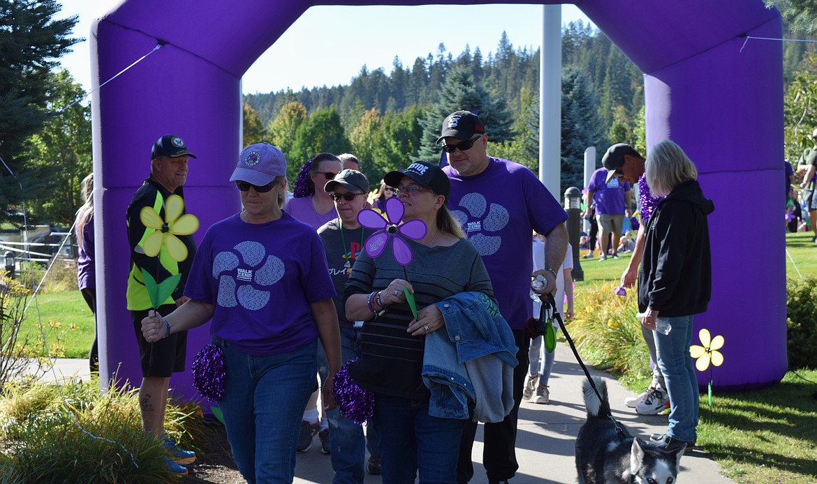 A few hundred people walked the 3-mile loop at Riverstone Park in Coeur d'Alene, most wearing purple and many carrying flowers — each differently-colored flower signifying their personal connection to the disease. Some walked to remember or in support of a loved one with Alzheimer’s, while others simply came out to support the cause.