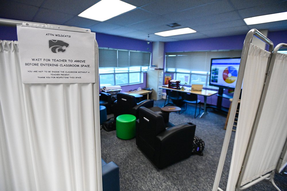 The remaining classes continue to be held at the high school in rooms unaffected by construction. The wrestling room, for example, was turned into a classroom with plywood placed over the mats to protect them from desks. The library has been divided up with partitions to move special education classes into a quiet space.