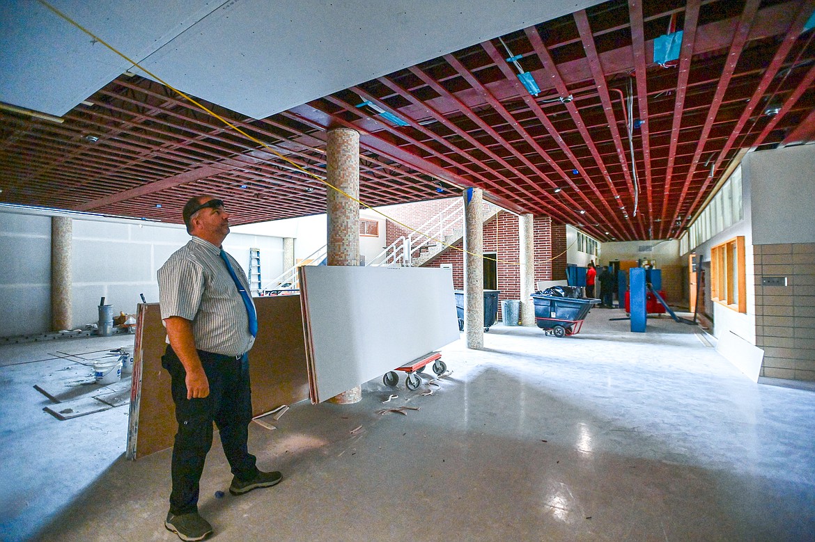 Ceiling tiles are replaced inside one of the classrooms at Columbia Falls High School on Tuesday, Sept. 17. (Casey Kreider/Daily Inter Lake)